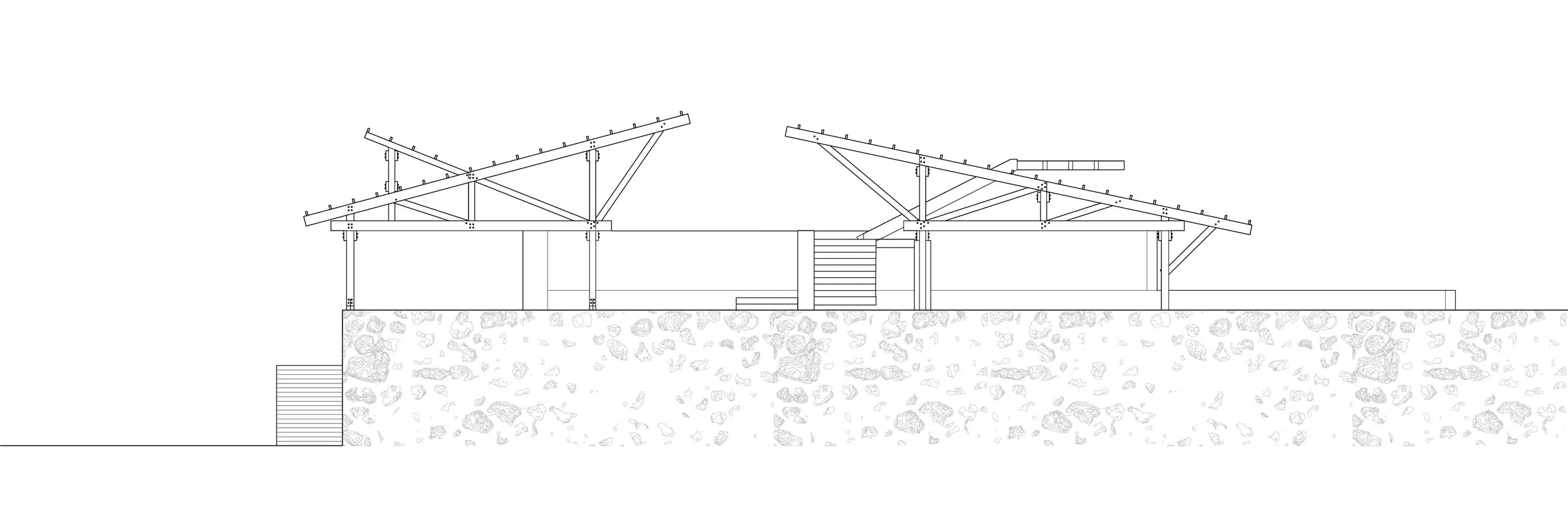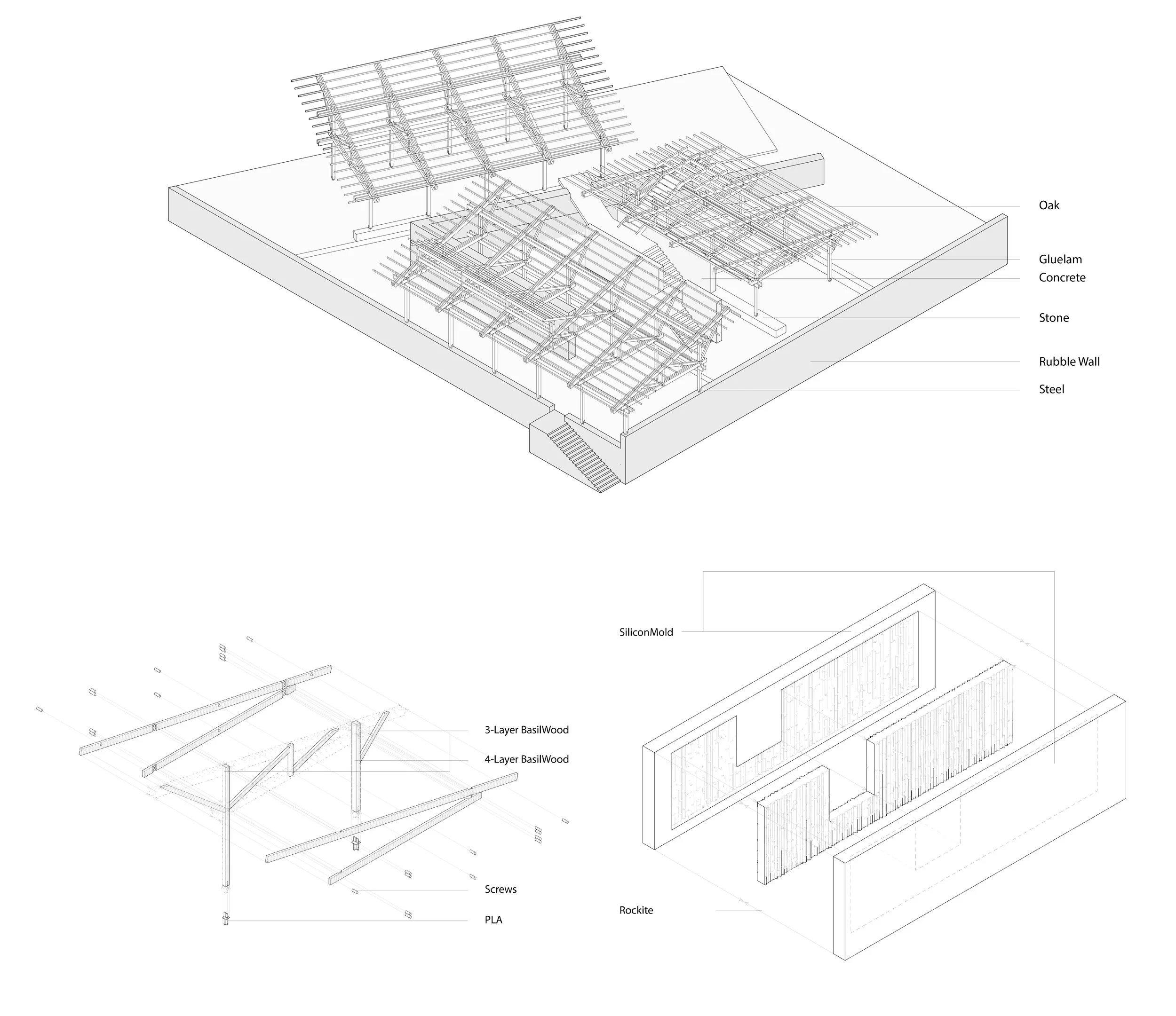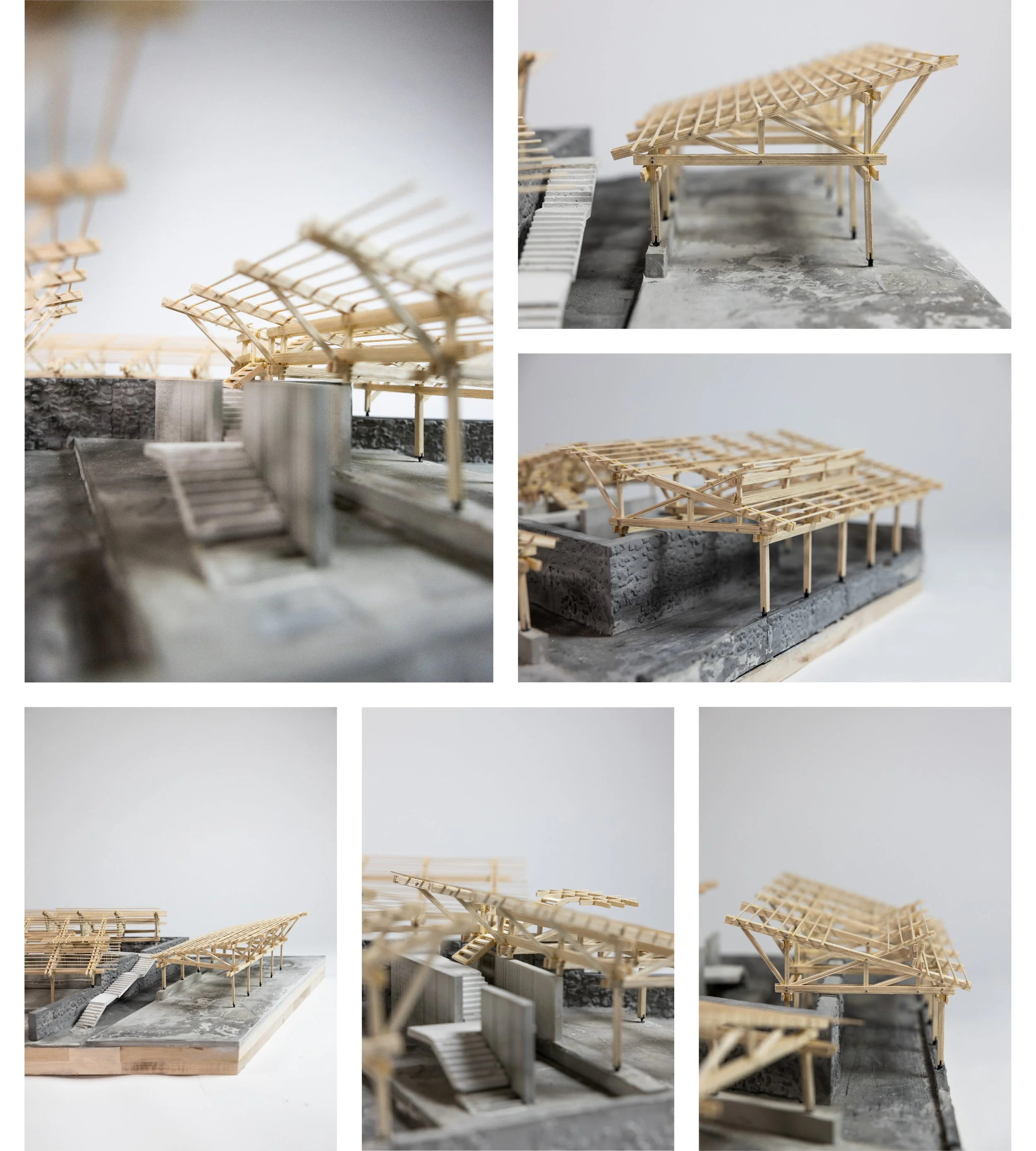 In our 1:50 structural model, we faithfully replicated the glulam trussed frames while also representing the building’s textured surfaces, including rubble walls and bamboo-cast concrete.
